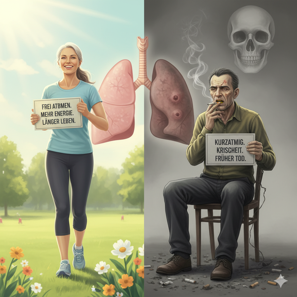 Rauchen zerstört still und heimlich. Nichtrauchen heilt – leise, aber konsequent. Und das Beste: Es ist nie zu spät, aufzuhören. Selbst wenn du jahrzehntelang geraucht hast, lohnt sich der Rauchstopp. Dein Körper verzeiht dir mehr, als du denkst – gib ihm nur die Chance dazu.